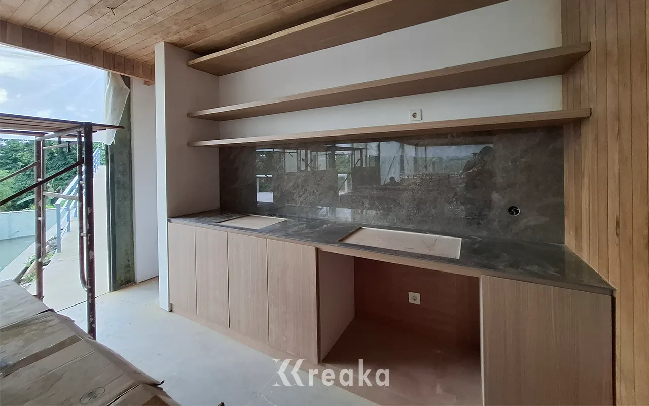 Furnitur yang kami hadirkan di proyek ini dibuat dengan material plywood meranti berlapis HPL. Plywood meranti dipilih karena memiliki kekuatan yang baik, tahan terhadap kelembapan. Lapisan High Pressure Laminate (HPL) memberikan permukaan yang halus, tahan gores, mudah dibersihkan, dan tersedia dalam berbagai pilihan tekstur sehingga dapat menambah kesan estetis sekaligus praktis. Kombinasi ini menjadikan furnitur tidak hanya indah secara visual, tetapi juga awet, fungsional, dan minim perawatan.
