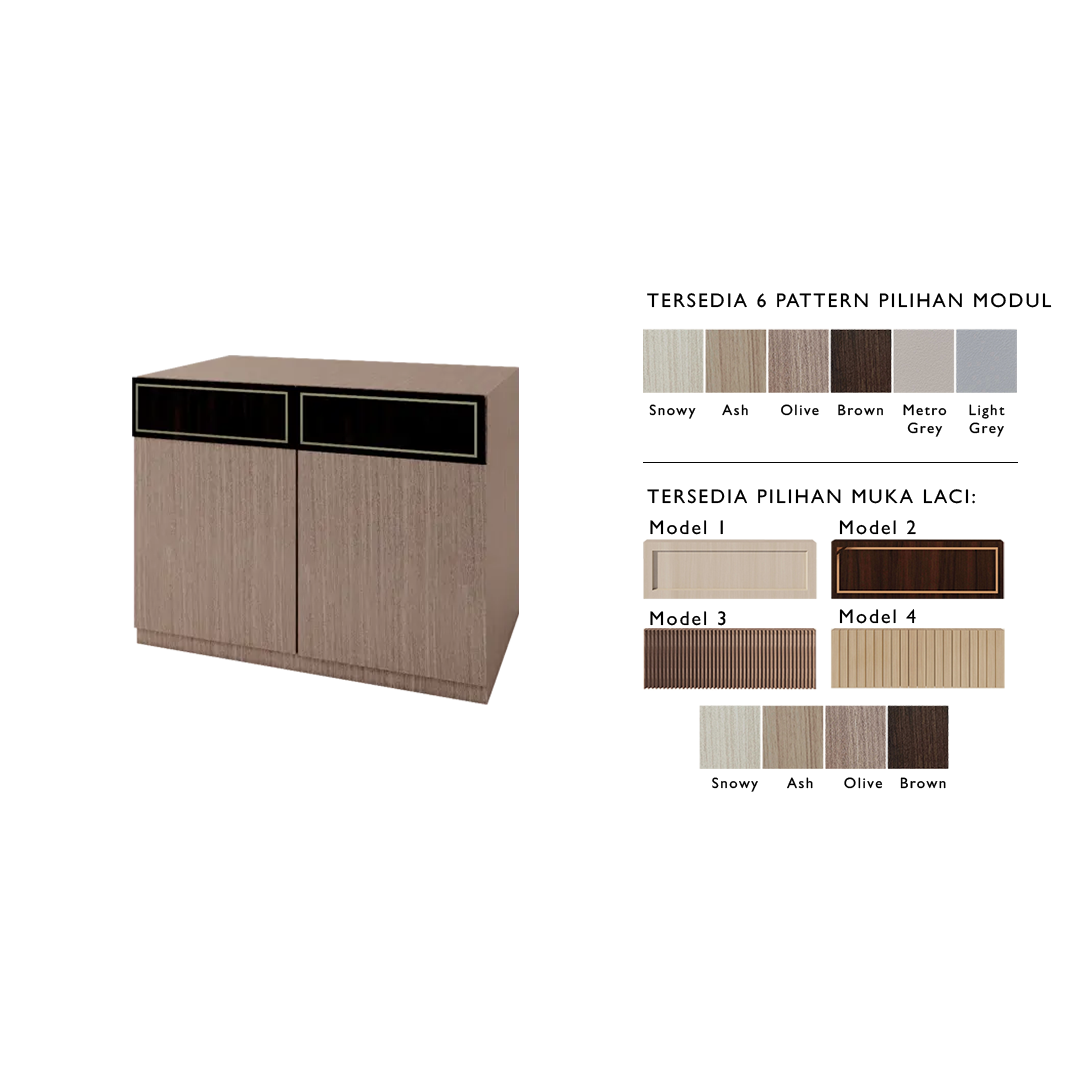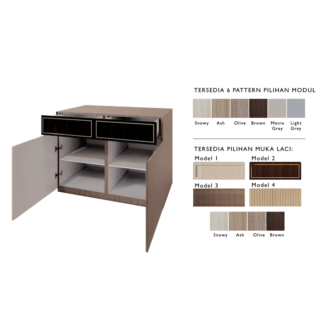 Pelapis: Menggunakan HPL bertekstur (pilihan warna: Snowy, Ash, Olive, Brown, Light Grey, dan Metro Grey) pada bagian luar modul. Sementara itu, bagian dalam modul dilapisi HPL putih polos untuk tampilan yang bersih dan rapi.