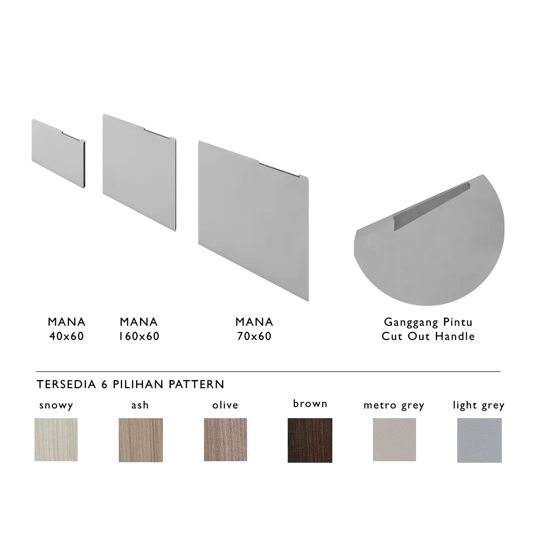 Pelapis: Menggunakan HPL bertekstur (pilihan warna: Snowy, Ash, Olive, Brown, Light Grey, dan Metro Grey) pada bagian depan dan samping pintu. Sementara itu, bagian belakang pintu dilapisi HPL putih polos untuk tampilan yang bersih dan rapi.
